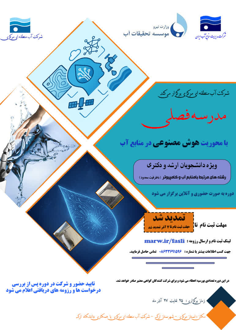 شرکت آب منطقهای مرکزی با هدف بهرهگیری از فناوریهای نوین در مدیریت منابع آب و ارتقای دانش تخصصی نسل جوان، مدرسه فصلی با محوریت «هوش مصنوعی در منابع آب» ویژه دانشجویان ارشد و دکتری را برگزار میکند.