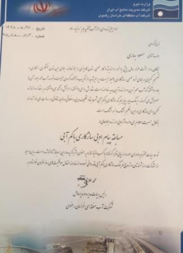 با کمال مسرت اعلام می دارد اثر ادبی و ارزنده جنابعالی در مسابقه پیام ادبی سازگاری با کم آبی توسط هیأت محترم داوران مورد ارزیابی قرار گرفته و با کسب امتیاز لازم به عنوان اثر برگزیده در این مسابقه شناخته شده است. بدین وسیله از مشارکت ارزشمندتان در ترویج فرهنگ سازگاری با کم آبی قدردانی نموده و از خداوند متعال موفقیت های روز افزون خواستارم.