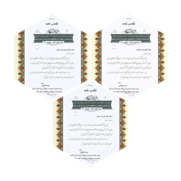 "با توجه به اینکه شرکت آب منطقه ای استان حائز رتبه برتر در ارزیابی عملکرد دستگاههای اجرایی استان در جشنواره شهید رجایی سال 1399 شده است، جنابعالی بعنوان عضو مؤثر تیم کاری آن اداره کل معرفی شده اید. لذا از تلاشهای ارزشمند شما تقدیر و تشکر بعمل می آید."