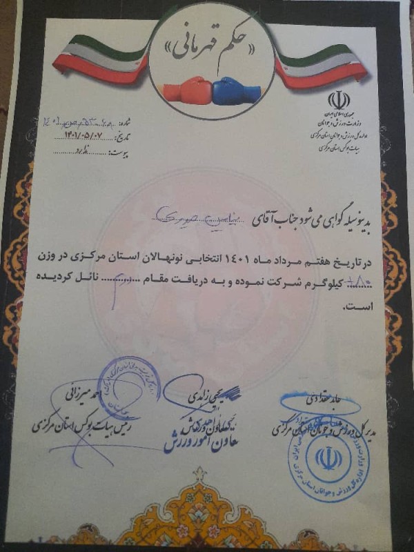 به گزارش روابط عمومی شرکت آب منطقه ای مرکزی، در متن این لوح تقدیر که به امضای مدیر کل ورزش و جوانان، رئیس هیأت بوکس و معاون امور ورزشی اداره کل ورزش و جوانان استان رسیده، آمده است: در تاریخ هفتم مرداد ماه 1401 انتخابی نونهالان استان مرکزی در وزن بالای 80 کیلوگرم شرکت نموده و به دریافت مقام دوم نائل گردیده اید.