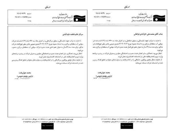 «انتظار میرود با همکاری سایر اعضای هیأتمدیره و هماهنگی با مدیران شرکت، در پیشبرد برنامههای وزارت نیرو و انجام وظایف مقرر در اساسنامه اهتمام ویژه به عمل آورید.»